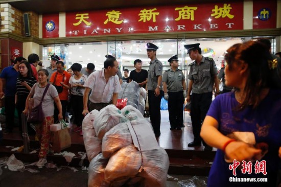 9月15日,商戶在北京天意商城甩賣商品,吸引大批顧客搶購。天意商城是北京規模最大的小商品批發兼零售市場,為疏解北京非首都功能,天意商城將于9月16日關門停業。中新社記者 盛佳鵬 攝