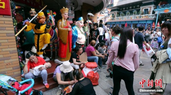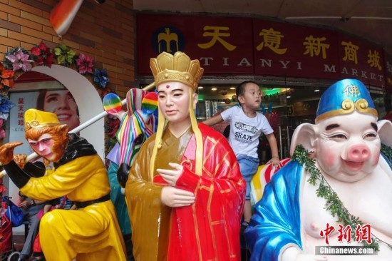 9月15日,一孩童坐在天意門前西游記師徒雕像上遠眺。當日,自1992年開業至今的北京天意市場迎來其在北京西城阜外大街營業的最后一日,商家趁機“瘋狂甩貨”,大批北京民眾也紛至沓來。這里曾是北京著名的小商品商城,聚集了數千家商戶。為疏解北京非首都功能,天意商城將于本月16日關門停業。中新社記者 崔楠 攝