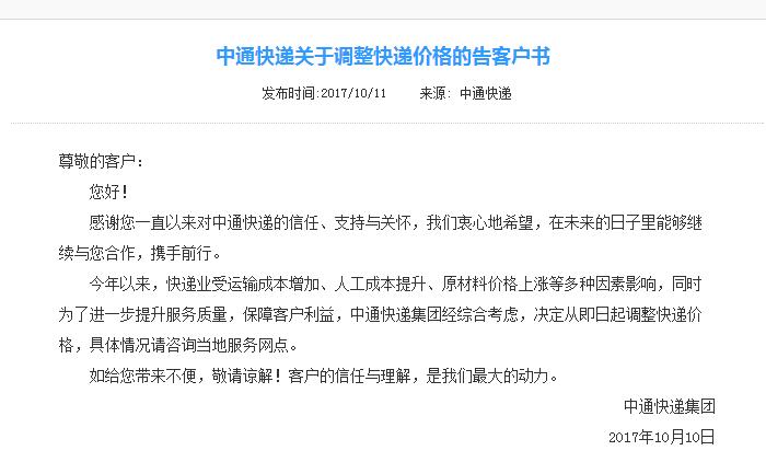 而中通快遞于10月10日也公布漲價訊息,官網刊文稱,中通快遞集團經綜合考慮,決定從即日起調整快遞價格,具體情況請咨詢當地服務網點。