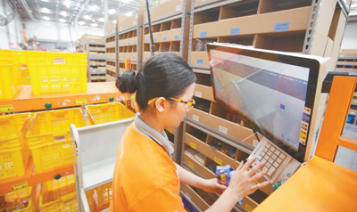 圖為11月12日,在菜鳥網絡廣東惠陽超級機器人倉,工作人員正在操縱機器人分揀線。以往一個揀貨員一天走六七萬步只能揀貨1000多件,在機器人的幫助下,一個揀貨員一天只走兩三千步,揀貨數量卻是原來的3倍多。 |