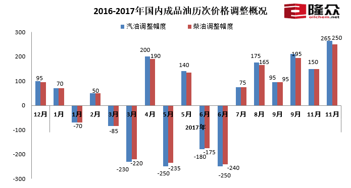“11月17日0點將上調汽柴油限價,每噸汽油上調265、柴油上調250元,折合每升89#0.19、92#0.21、95#0.22、0#0.21元!甭”娰Y訊成品油分析師趙桂珍表示,本次調價是年內第十次上調,也創下今年年內最大漲幅。本次調價過后,2017年成品油調價將呈現“十漲六跌六擱淺”的格局。下一次調價窗口將在2017年11月30日24時開啟。