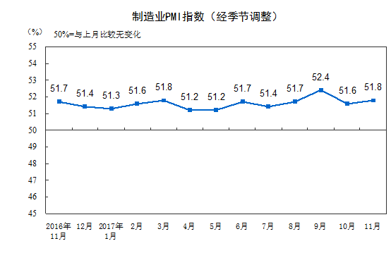 人民網北京11月30日電 據國家統計局網站消息,2017年11月份,中國制造業采購經理指數(PMI)為51.8%,比上月上升0.2個百分點,制造業繼續保持穩中有升的發展態勢。
