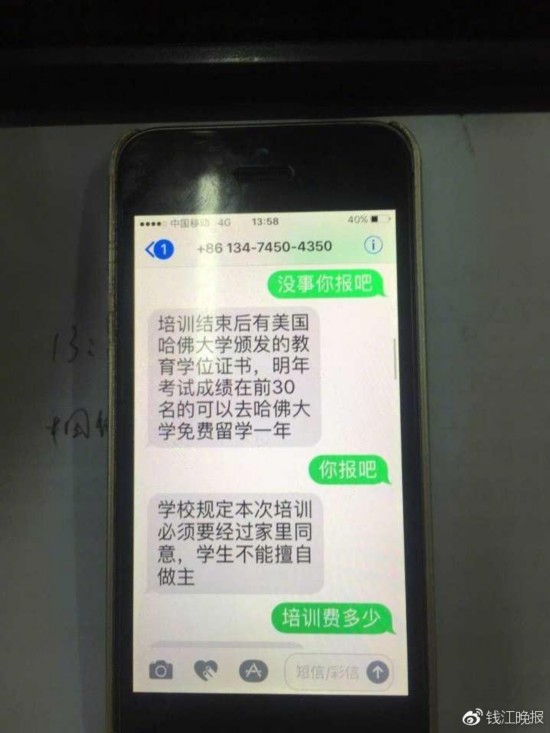 “爸,我是小麗。上午洗衣服手機掉水里開不了機,現在在上課,借了同學手機,跟你說件十萬火急的事。我們學校邀請了美國哈佛大學的資深教授來校面授培訓,名額有限。一堂課46800,你看我去不去呀?”