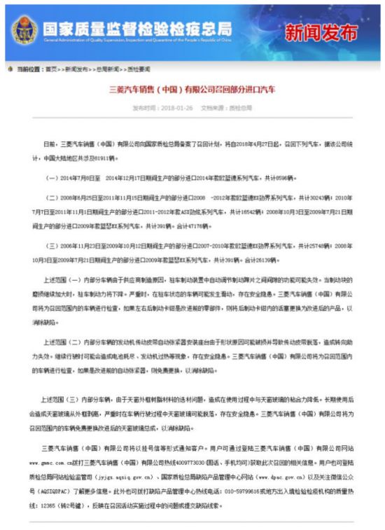 日前,三菱汽車銷售(中國)有限公司向國家質檢總局備案了召回計劃,將自2018年4月27日起,召回下列汽車,據該公司統計,中國大陸地區共涉及81911輛。