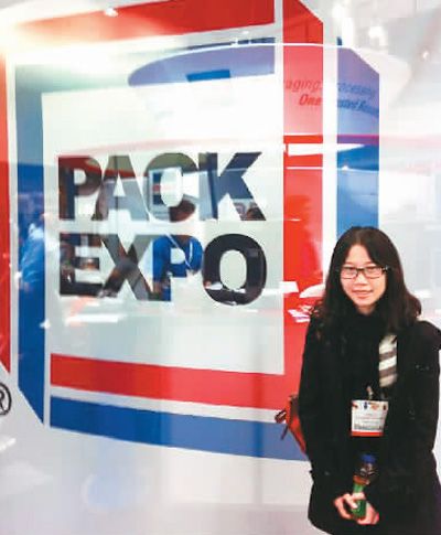 圖為李穎留學時參加美國最大的包裝展時的留影。