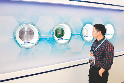 | 2017年10月25日,在上海舉辦的中國電子展上,參觀者在觀看一個由納米光罩和晶圓凸塊等芯片制造材料組成的展示墻。 |