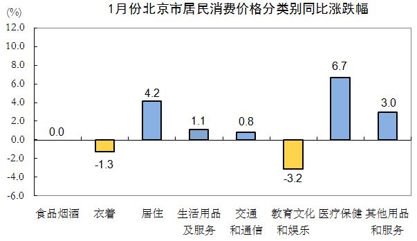 1月份,北京市居民消費價格總水平環比上漲0.4%。其中,食品價格上漲2.0%,非食品價格上漲0.1%;消費品價格上漲0.6%,服務價格上漲0.1%。