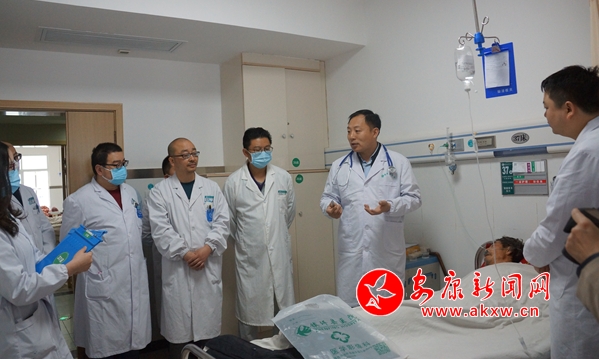 練學淦首先在鎮坪縣醫院內科病區,以2名腦梗塞患者為例進行示范性教學查房,來到病房詳細聽取了主管醫生的病例匯報。在凝神聽取主管醫生的匯報后,練主任在患者床旁同患者及家屬交談,并親自進行查體,了解疾病發展過程中的每個細節,一絲不茍的從頭查起。