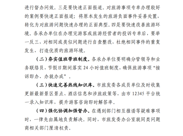 (二)夯實(shí)值班帶班制度。各承辦單位要明確分管領(lǐng)導(dǎo)和業(yè)務(wù)聯(lián)絡(luò)員,節(jié)假日期間落實(shí)24小時(shí)值班制度,確保旅游事項(xiàng)“接訴即辦、辦就辦成”。