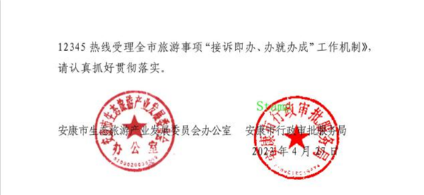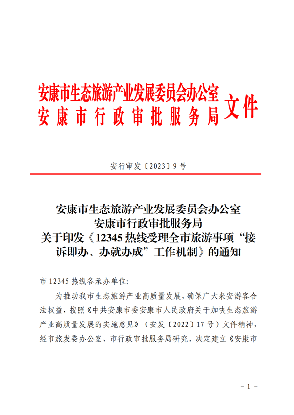 為推動(dòng)我市生態(tài)旅游產(chǎn)業(yè)高質(zhì)量發(fā)展,確保廣大來(lái)安游客合法權(quán)益,按照《中共安康市委安康市人民政府關(guān)于加快生態(tài)旅游產(chǎn)業(yè)高質(zhì)量發(fā)展的實(shí)施意見》(安發(fā)〔2022〕17號(hào))文件精神,經(jīng)市旅發(fā)委辦公室、市行政審批服務(wù)局研究,決定建立《安康市12345熱線受理全市旅游事項(xiàng)“接訴即辦、辦就辦成”工作機(jī)制》,請(qǐng)認(rèn)真抓好貫徹落實(shí)。