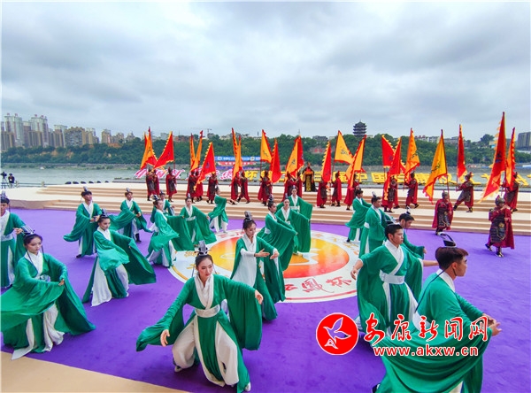 悠悠古琴聲中,青衣女子們手提竹籃蹁躚而來。“緬懷先賢”,主祭官一聲令下,全場(chǎng)矚目中,9位大漢護(hù)送屈原像至舞臺(tái)中央,開幕式翻開祭祀篇章。主祭官走向高臺(tái)仰頸高呼:“詠頌祭文……”百名身著漢服、手持竹簡(jiǎn)的孩童齊聲詠頌,頓挫抑揚(yáng),激蕩云霄。“萬民歡慶歌盛世,安瀾裕阜唱安康。”典禮儀成,青衣女子們“兵分兩列”,一列把竹籃里面的粽子拋向江中,追念先賢,一列繞場(chǎng)為現(xiàn)場(chǎng)觀眾贈(zèng)發(fā)香包,送上幸福安康的祝福。