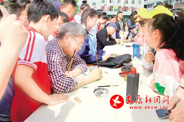 4月20日,白河縣城關小學舉辦讀書節活動,縣文聯書法家為孩子們書寫書簽。陳華 攝