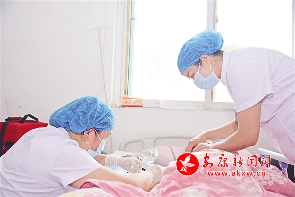 十幾分鐘后,白河縣人民醫(yī)院PICC專科護(hù)士袁茜和杜曉雨帶著醫(yī)藥箱趕到城關(guān)鎮(zhèn)廣興金座8號(hào)樓3層樊阿姨家里。