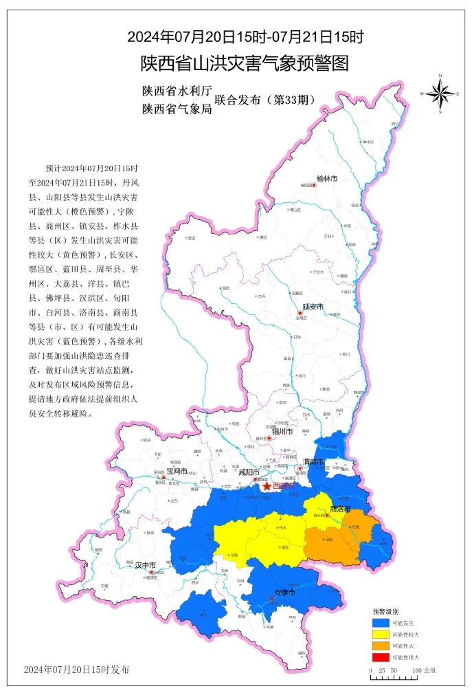 陜西省水利廳與省氣象局聯合發布山洪災害預警,預計7月20日15時至7月21日15時,下圖中所示縣(區)可能發生山洪災害預警:其中我市寧陜縣發生山洪災害可能性較大(黃色預警),漢濱區、旬陽市、白河縣有可能發生山洪災害(藍色預警),各級水利部門要加強山洪隱患巡查排查,做好山洪災害站點監測,及時發布區域風險預警信息,地方政府應依法提前組織人員安全轉移避險。