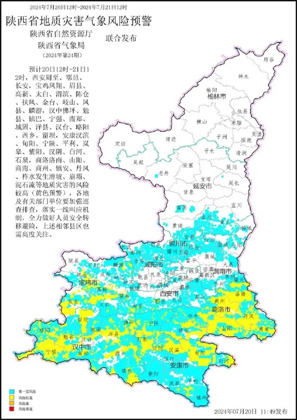 陜西省自然資源廳與省氣象局聯合發布地質災害氣象風險黃色預警,預計7月20日12時至7月21日12時,下圖所示縣(區)可能發生地質災害:其中我市漢濱、旬陽、寧陜、平利、嵐皋、紫陽、漢陰、白河、石泉發生滑坡、崩塌、泥石流等地質災害的風險較高(黃色預警),各地及有關部門單位要加強巡查排查,落實一線叫應機制,全力做好人員安全轉移避險,上述相鄰縣區也需高度關注。