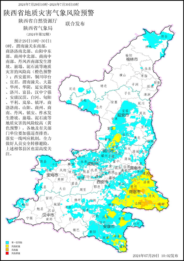 陜西省自然資源廳與陜西省氣象局聯(lián)合發(fā)布地質(zhì)災(zāi)害氣象風(fēng)險預(yù)警:7月29日10時至7月30日10時,下圖所示縣(區(qū))可能發(fā)生地質(zhì)災(zāi)害:其中我市漢濱、白河、旬陽、平利、嵐皋、鎮(zhèn)坪發(fā)生滑坡、崩塌、泥石流等地質(zhì)災(zāi)害的風(fēng)險較高(黃色預(yù)警),各地及有關(guān)部門單位要加強(qiáng)巡查排查,落實一線叫應(yīng)機(jī)制,全力做好人員安全轉(zhuǎn)移避險,上述相鄰縣區(qū)也需高度關(guān)注。