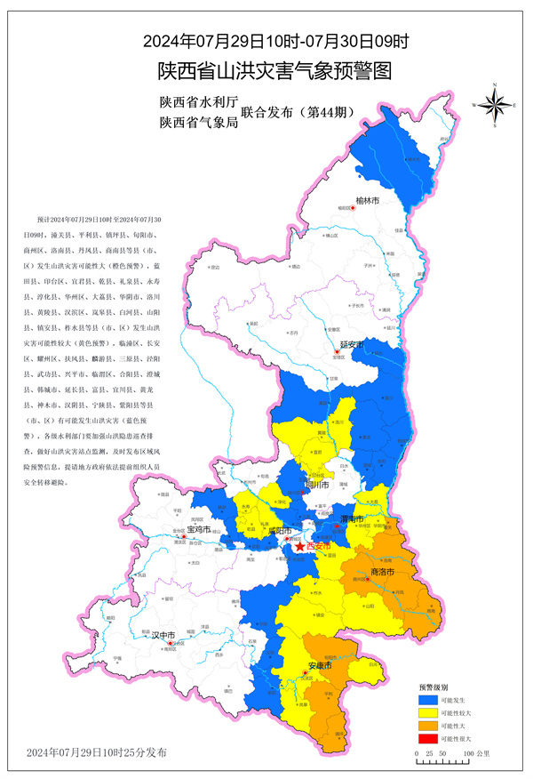 陜西省水利廳與陜西省氣象局聯(lián)合發(fā)布山洪災(zāi)害氣象預(yù)警:預(yù)計7月29日10時至7月30日9時,下圖中所示縣(區(qū))可能發(fā)生山洪災(zāi)害,其中我市漢濱區(qū)、嵐皋縣、白河縣發(fā)生山洪災(zāi)害可能性較大(黃色預(yù)警),漢陰縣、寧陜縣、紫陽縣有可能發(fā)生山洪災(zāi)害(藍(lán)色預(yù)警),各級水利部門要加強(qiáng)山洪隱患巡查排查,做好山洪災(zāi)害站點(diǎn)監(jiān)測,及時發(fā)布區(qū)域風(fēng)險預(yù)警信息,地方政府應(yīng)依法提前組織人員安全轉(zhuǎn)移避險。