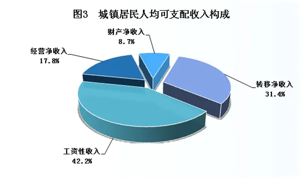全市城鎮(zhèn)居民人均可支配收入33639元,比上年增加1663元,增長5.2%。其中,工資性收入14181元,增長5.0%,占可支配收入的比重為42.2%;經(jīng)營凈收入5995元,增長4.7%,占比17.8%;財(cái)產(chǎn)凈收入2910元,增長5.8%,占比8.7%;轉(zhuǎn)移凈收入10553元,增長5.6%,占比31.4%。