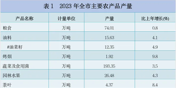 全年糧食產(chǎn)量74.01萬噸,比上年增長0.8%。其中,夏糧24.88萬噸,增長0.7%;秋糧49.13萬噸,增長0.9%。全年谷物產(chǎn)量48.00萬噸,增長0.1%。其中,稻谷產(chǎn)量13.84萬噸,下降3.3%;小麥產(chǎn)量8.47萬噸,下降0.6%;玉米產(chǎn)量25.46萬噸,增長2.3%。
