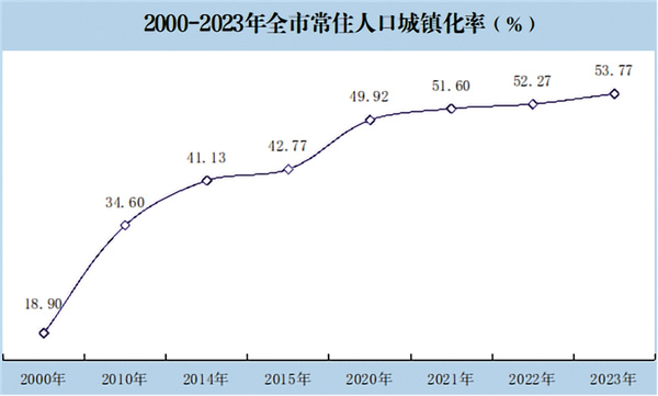 城鎮(zhèn)化步伐明顯加快。1949年,安康總?cè)丝?46.75萬人,其中農(nóng)業(yè)人口占89.4%,屬于典型傳統(tǒng)的農(nóng)村社會,交通不便,人員相對封閉不流動。改革開放后,市場經(jīng)濟體制逐步建立,特別是2000年撤地設(shè)市,對安康具有劃時代和里程碑的意義。2021年旬陽撤縣設(shè)市,成為陜南首個縣級市,標(biāo)志著全市城鎮(zhèn)化步伐邁向更高水平。全市抓住東部勞動密集型產(chǎn)業(yè)向中西部轉(zhuǎn)移的機遇,依托易地搬遷集中安置點,大力興辦新社區(qū)工廠,把農(nóng)民變?yōu)榫用瘢罅﹂_展新環(huán)境、新服務(wù)、新產(chǎn)業(yè)、新民風(fēng)、新生活“五新”社區(qū)創(chuàng)建工作,完善配套設(shè)施,健全服務(wù)體系,城鎮(zhèn)化建設(shè)步伐顯著加快。2023年,全市戶籍人口300.75萬人,常住人口245.72萬人。常住人口城鎮(zhèn)化率由2000年的18.9%,提高到2023年的53.77%,23年間提高了34.87個百分點。