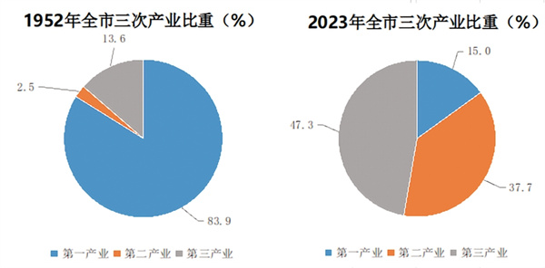 產(chǎn)業(yè)結(jié)構(gòu)日趨優(yōu)化。1952年,全市三次產(chǎn)業(yè)比為83.9︰2.5︰13.6,產(chǎn)業(yè)結(jié)構(gòu)呈“一、三、二”模式,為典型的農(nóng)業(yè)市,隨著工業(yè)經(jīng)濟和第三產(chǎn)業(yè)的不斷發(fā)展,全市第一產(chǎn)業(yè)比重逐年下降,二、三產(chǎn)業(yè)比重逐年上升,2012年三次產(chǎn)業(yè)比為19.4︰42.7︰37.9,第一產(chǎn)業(yè)占比首次低于20.0%,第二產(chǎn)業(yè)突破40.0%,產(chǎn)業(yè)結(jié)構(gòu)呈“二、三、一”模式;隨著第三產(chǎn)業(yè)不斷壯大,2020年占比45.3%,躍居三產(chǎn)之首,呈“三、二、一”模式,并連續(xù)保持4年,2023年全市三次產(chǎn)業(yè)之比15.0︰37.7︰47.3,以服務(wù)業(yè)為主的產(chǎn)業(yè)結(jié)構(gòu)加速形成。