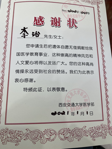 15年來,李治還積極資助困難學生、為災區捐資捐物,為他人、為社會付出了很多,但他總覺得不夠。2021年,他自愿申請并成功登記為遺體捐獻志愿者。“這是我那年送給自己的新年禮物。”他指著西安交通大學醫學部的感謝狀說。RKM安康新聞網
