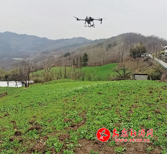 眼下正值春季管護黃金期,在白河縣冷水鎮興隆村糧油示范田里,無人機在油菜田上方來回穿梭,均勻細密地噴灑農肥,抑制病菌繁殖,提高油菜產量。周紫薇 攝VgR安康新聞網