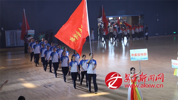 開幕式在暖場節(jié)目《幸福安康》的表演中拉開序幕。伴隨著高昂而優(yōu)美的旋律,儀仗隊隊員護擁著會旗與代表本屆市運會核心主題的標語隊步伐矯健地入場。由全市教育、體育、科技、文化、衛(wèi)生五大領(lǐng)域的杰出代表組成的觀禮團代表從主席臺前走過。緊隨其后的裁判員隊伍、13個青少年組運動員代表團、32 個行業(yè)組運動員代表團闊步入場,展現(xiàn)出朝氣蓬勃的精神風貌。入場儀式完畢,全場起立,面向國旗,奏唱中華人民共和國國歌。運動員代表與裁判員分別宣誓。
