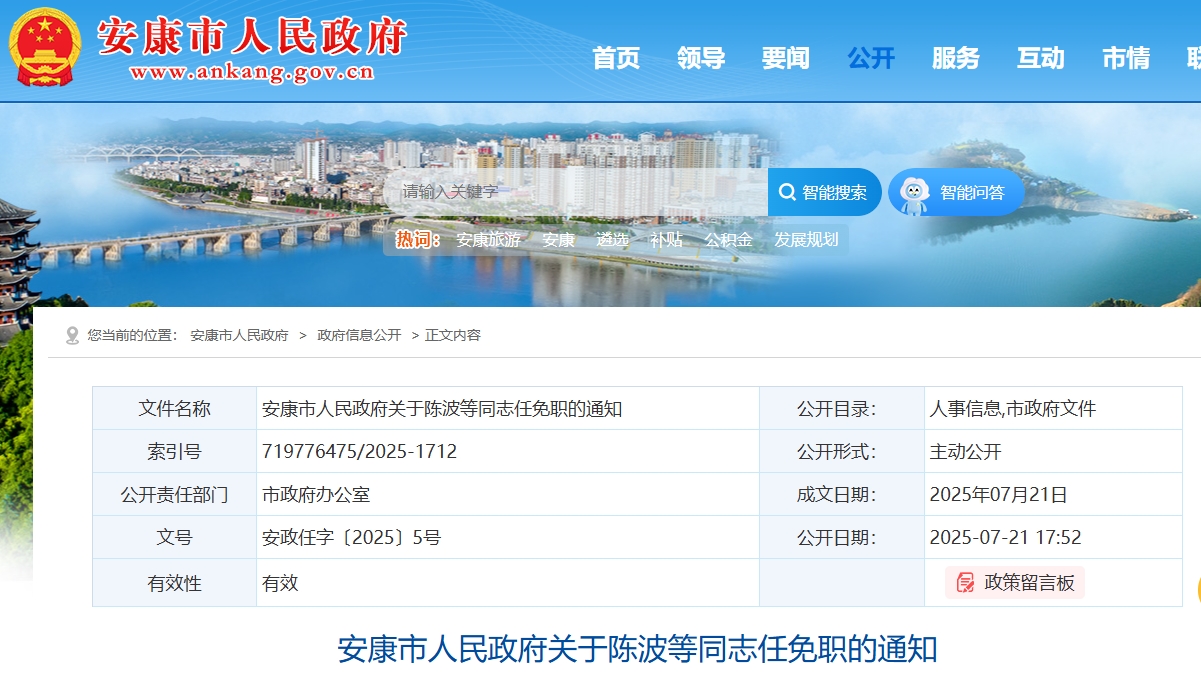 陳波同志任市人民政府副秘書長(掛職),掛職時間自2025年7月起,掛職期為2年,掛職期滿掛任職務自行免除,不再另行通知;HS6安康新聞網