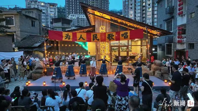 第一篇章:“紅歌嘹亮·歲月回響”(70年代篇)演出中,紫陽(yáng)縣的大學(xué)生們?yōu)楝F(xiàn)場(chǎng)觀眾演出了《北京的金山上》《南泥灣》等紅色經(jīng)典歌曲,引得市民和游客駐足觀看,并給予熱烈掌聲。