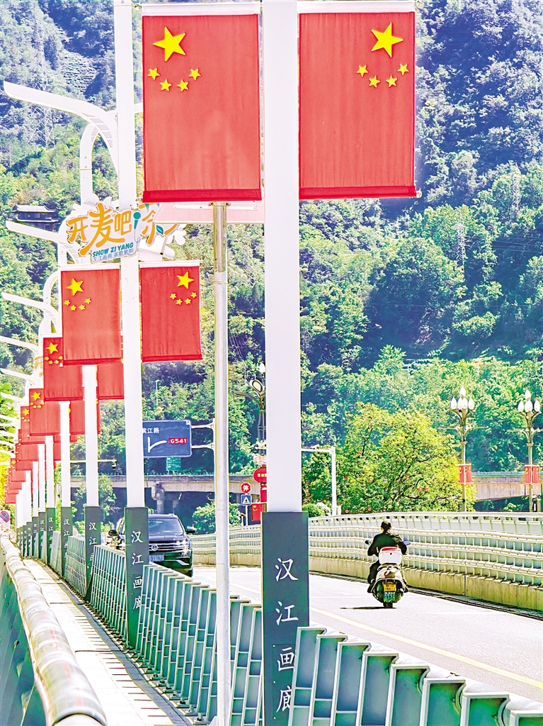 在嵐皋縣大橋兩側,一面面整齊的五星紅旗迎風飄揚,喜迎國慶。 李王灝 攝wxP安康新聞網