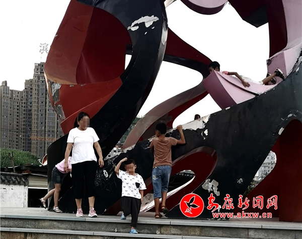近日,記者在漢調二黃文化園看到,游玩的市民絡繹不絕,大部分市民都能做到文明游園,但其中也存在不文明行為。這里是文化園主題雕塑,幾個10歲左右的小男孩不斷攀爬雕塑,并在離地面約2米的高處逗留,現場既無工作人員勸導也沒有“禁止攀爬”的相關提示牌。記者 潘潤生 攝qSu安康新聞網