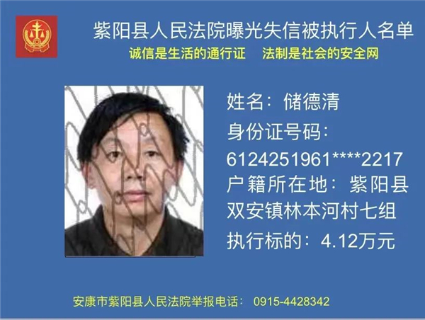 被執(zhí)行人儲(chǔ)德清,你因不履行(2017)陜0924民初241號民事判決書確定的義務(wù),已被紫陽縣人民法院納入失信被執(zhí)行人名單庫依法進(jìn)行信用懲戒。信用懲戒范圍包括但不限于以下措施: