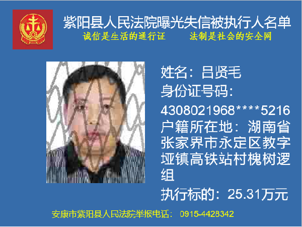 被執(zhí)行人呂賢毛,你因不履行(2017)陜0924民初241號(hào)民事判決書確定的義務(wù),已被紫陽縣人民法院納入失信被執(zhí)行人名單庫(kù)依法進(jìn)行信用懲戒。信用懲戒范圍包括但不限于以下措施: