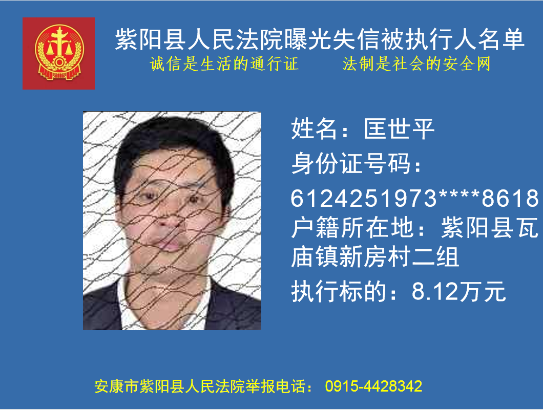 被執(zhí)行人匡世平,你因不履行(2017)陜0924民初241號民事判決書確定的義務(wù),已被紫陽縣人民法院納入失信被執(zhí)行人名單庫依法進(jìn)行信用懲戒。信用懲戒范圍包括但不限于以下措施: