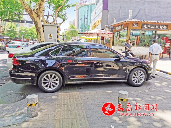 6月30日,在漢濱區鼓樓街興安中路十字,汽車、摩托車占用人行道,給行人帶來不便。(記者 潘潤生 攝)……
