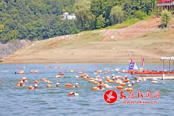 比賽現場,選手們你追我趕,在寬廣的湖中盡情體驗湖泊暢游的快感,享受著健身運動帶來的快樂。本次比賽場地選在瀛湖風景區翠屏島湖面,相較于傳統賽道比賽模式,天然水域上的比賽不但是游泳技巧的較量,更是勇氣、毅力、耐力的比拼。