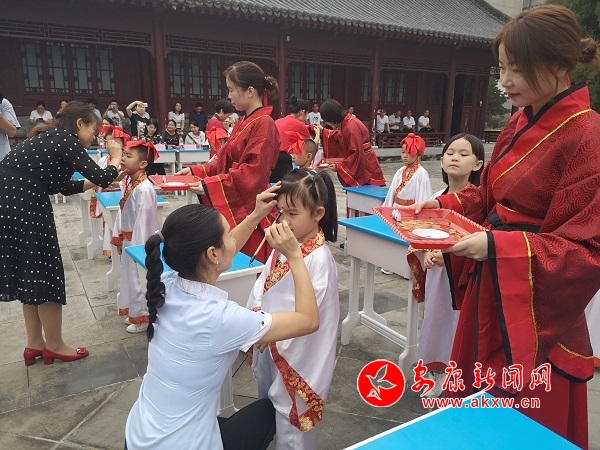 據了解,“開筆禮”是中國古代人生“四大禮”之首,是蒙童入學階段極為重要的儀式。“開筆禮”儀式主要分成六項內容,每一項內容承載著特定的教育目的。“正衣冠”要求學子們養成干凈整潔的生活習慣;“感恩鞠躬”讓學子向師長行揖禮,謝師恩、謝親恩,并為師者和長輩奉茶,讓他們從小懂得孝親尊師的道理;“凈手凈心”讓學子們從此靜心讀書,心無旁騖;“朱砂啟智”,表達了師長對學子們的美好祝愿,希望他們心明眼亮,聰慧過人;“擊鼓明志”讓學子們樹立遠大的理想與目標;“開筆啟蒙”書寫“人”字,學會做人的道理。蒙童通過親身經歷這種莊嚴古樸的儀式,實現從蒙童到學生的心理過渡。