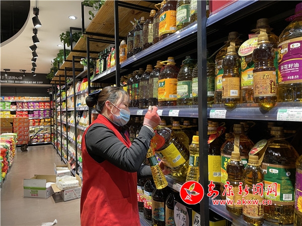 隨后,記者又來到了喜盈門超市中心店,工作人員會給每個進入人員進行體溫測量。超市內,工作人員也在持續給貨架補貨,貨架上物資很充足。