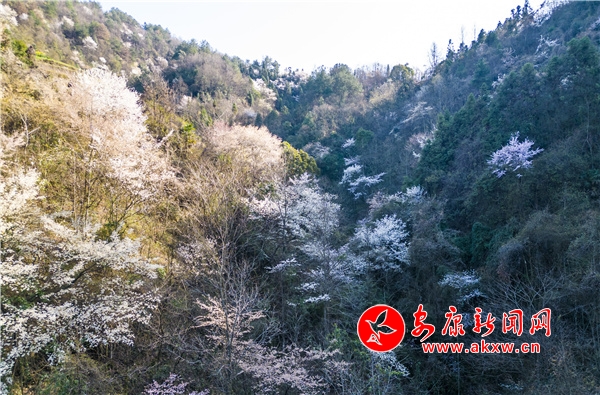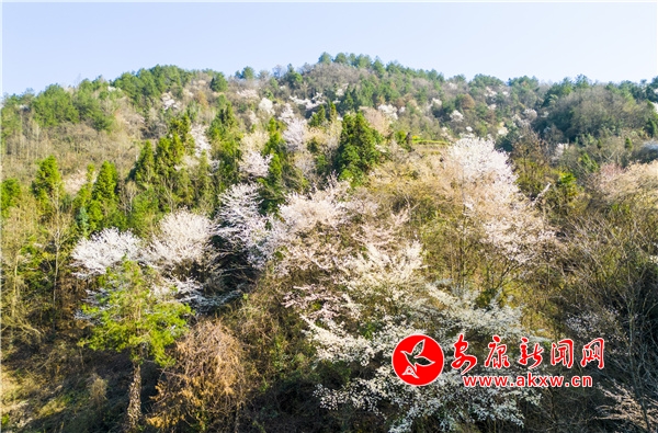 本網訊(記者 李俊 實習記者 卜昊天)近日,漢濱區晏壩鎮漫山的野生櫻桃花在和煦的春風中競相盛開。遠眺山林,從山腳到山頂次第綻放,山澗幽谷處處粉白,民居藏于其中,宛若世外桃源,起伏的山脈被一簇簇壓滿整個枝頭的櫻桃花所覆蓋。vZ2安康新聞網