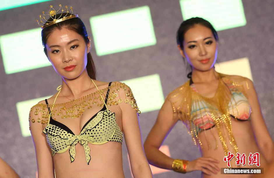 靚麗的模特、耀眼的黃金內衣……8月6日晚,一場以黃金為主題的時尚秀在南京國際會議中心上演,輪番登場的模特精彩演繹紫金愛濤珠寶所帶來的獨特魅力,其中一款價值過百萬、用萬足金打造的內衣更是令現場的觀眾過足了眼癮。 泱波 攝AZv安康新聞網