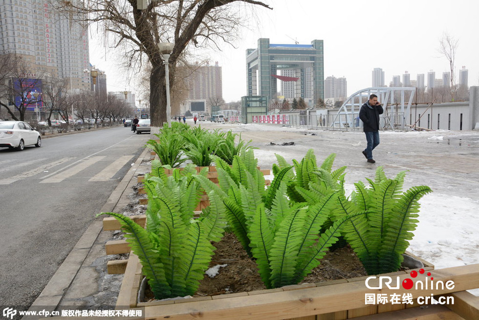 2015年3月15日,吉林省吉林市,在吉林市吉林大街上,市民從形似“油麥菜”的綠色塑料假花前行走。圖片來源:王凱冬tr2安康新聞網