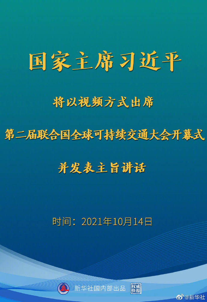 新華社北京10月13日電 外交部發言人華春瑩13日宣布:國家主席習近平將于10月14日以視頻方式出席第二屆聯合國全球可持續交通大會開幕式并發表主旨講話。