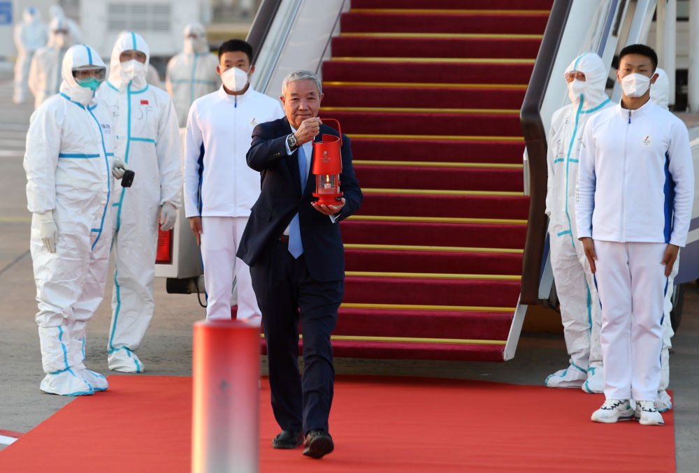 ⬆️北京冬奧組委特別代表、北京冬奧組委副主席于再清(左)手持火種燈走出艙門。ban安康新聞網