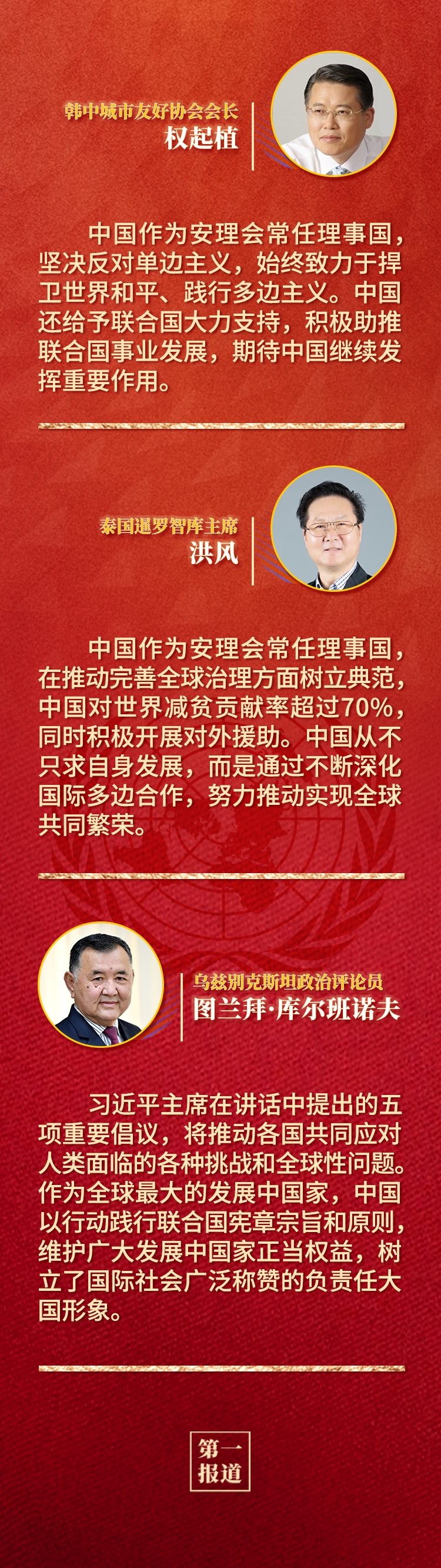 多國人士認為,中華人民共和國恢復聯合國合法席位是世界和聯合國歷史上的一個大事件,習近平主席的重要講話回顧了中國和平發展、造福人類的50年,為實現世界永續和平發展提出重要倡議,為全球共同推動構建人類命運共同體注入新的強大動力。