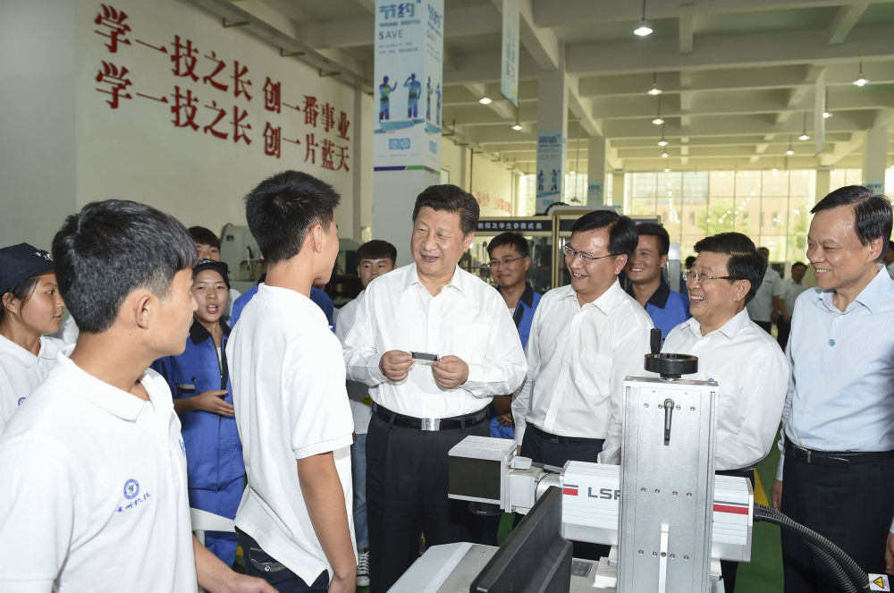 2015年6月17日,習近平在貴州省機械工業學校實訓基地勉勵學生加強操作訓練、不斷取得優異成績。