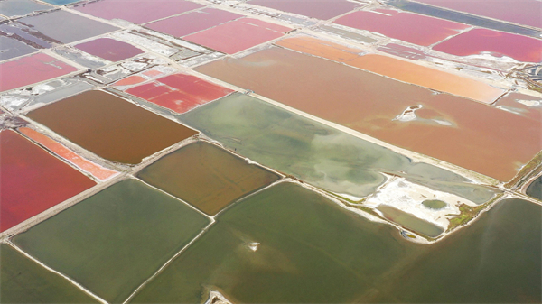 △運城鹽湖。夏季是鹽湖里微生物繁衍的旺盛期,不同的微生物使得鹽湖的不同池水呈現出不同的色彩,造就了七彩鹽湖的奇觀。(總臺記者裴大偉拍攝)