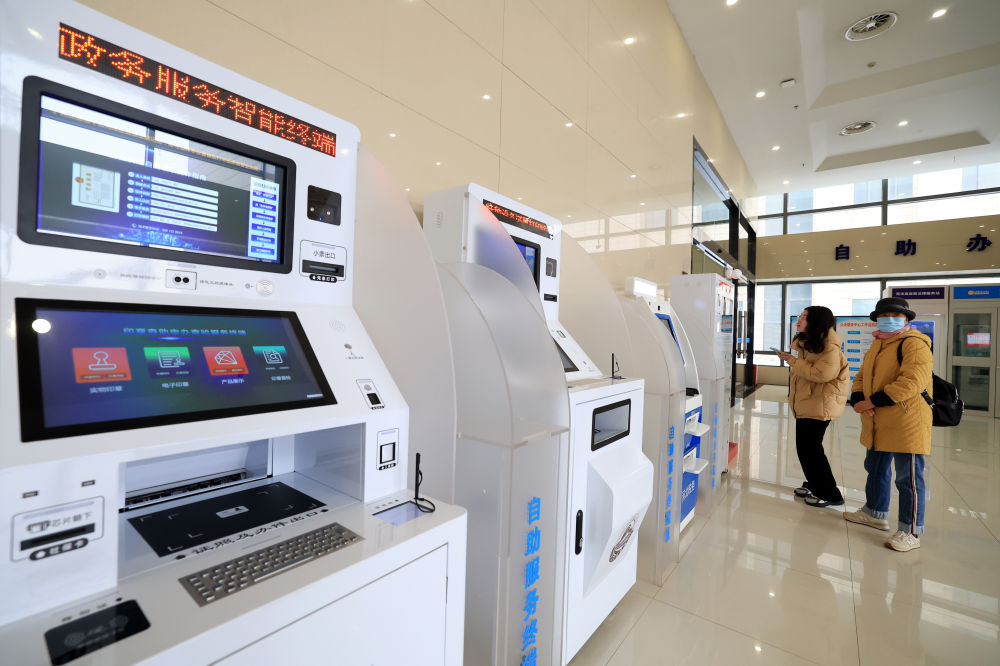 在河北省正定縣政務(wù)服務(wù)大廳,群眾利用政務(wù)服務(wù)便民自助終端機(jī)辦理業(yè)務(wù)。(梁子棟 攝)