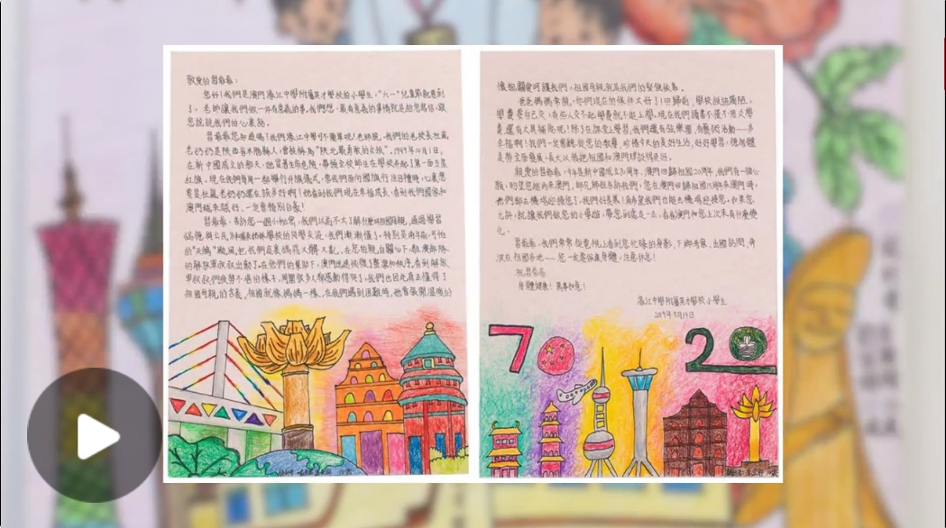 1949年10月1日,新中國成立當天,老校長杜嵐帶領師生毅然升起澳門第一面五星紅旗。2019年,“六一”國際兒童節前夕,濠江中學附屬英才學校的小學生們主動提出想給“敬愛的習爺爺”寫封信,并附上生動的彩筆畫。