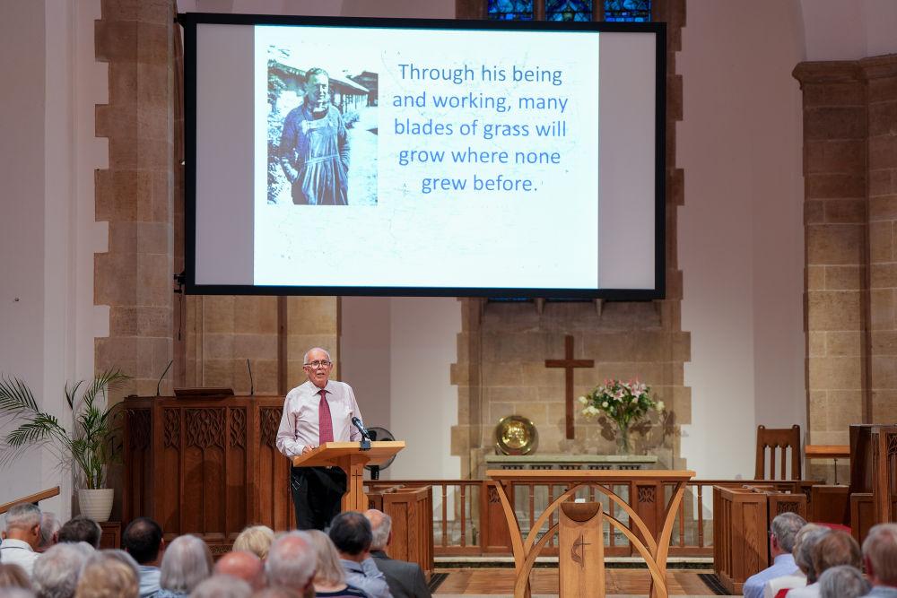 7月22日,在英國赫特福德郡哈彭登鎮,喬治·艾爾溫·何克的外甥馬克·艾爾溫·托馬斯在紀念活動上發表演講。新華社記者 吳魯 攝FUY安康新聞網
